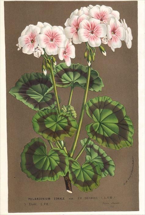タイトルは「PELARGONIUM ZONALE var. FR. DESBOIS.」、色鮮やかな多色石版画です。
