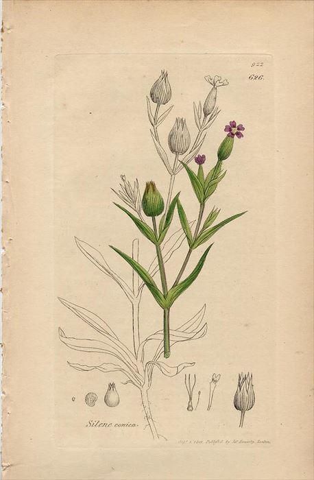 1840年 SOWERBY ENGLISH BOTANY 第2版 No.626 ナデシコ科 マンテマ属 ヒメシラタマソウ Silene conica sowe626