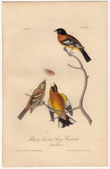 1840年 Audubon Birds of America Pl.206 ショウジョウコウカンチョウ科 チャバライカル Black-headed Song Grosbeak audboa1840-206