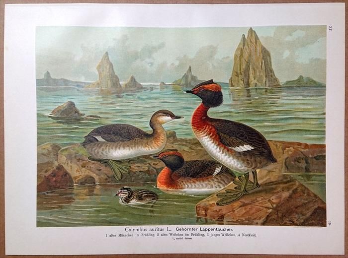 1902年 Naumann 中欧の鳥類の自然史 12巻 Pl.10 カイツブリ科 カンムリカイツブリ属 ミミカイツブリ 雄 雌 成鳥 若鳥 雛 naumann12-10