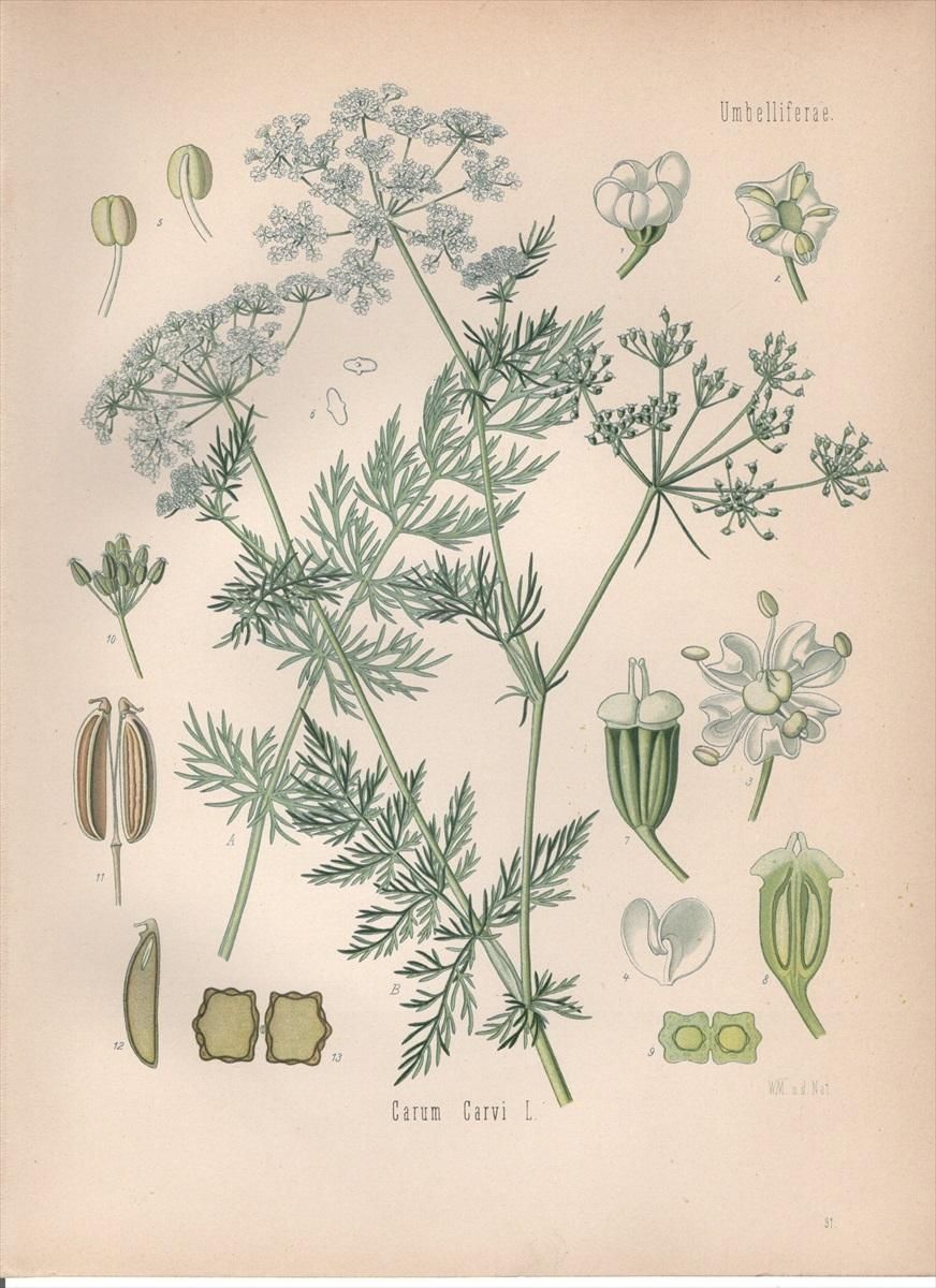 1890年 ケーラーの薬用植物 セリ科 ヒメウイキョウ属 ヒメウイキョウ Carum carvi L キャラウェイ kohler95