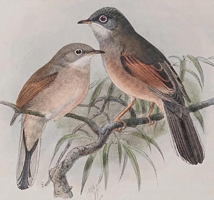 タイトルは「Spectacled Warbler. Sylvia conspicillata.」、現在使われている学名は「Curruca conspicillata 」、