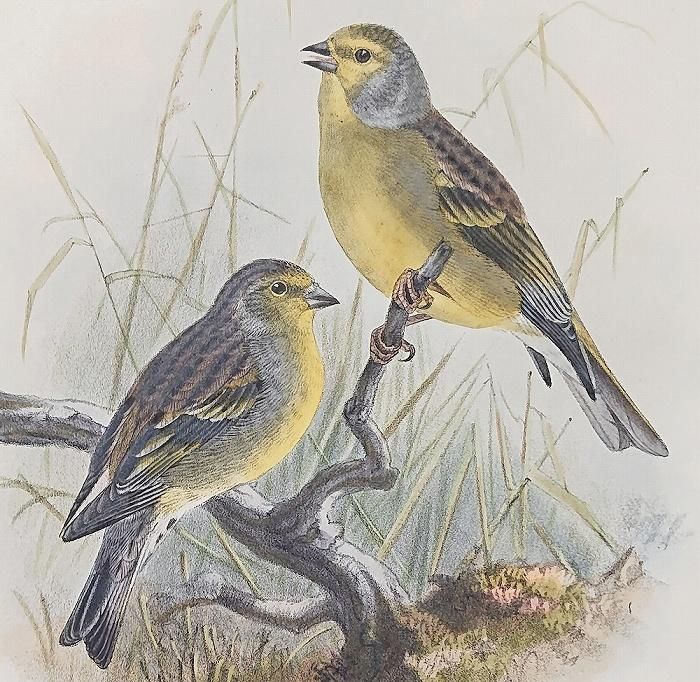 1871年 Dresser ヨーロッパ鳥類史 Pl.167 アトリ科 マヒワ属 シトロンヒワ Citril Finch 冬羽 dress167