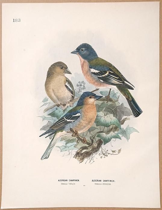 1871年 Dresser ヨーロッパ鳥類史 Pl.183 アトリ科 アゾレスチャフフィンチ Azorean Chaffinch ズアオアトリ亜種 Algerian Chaffinch dress183