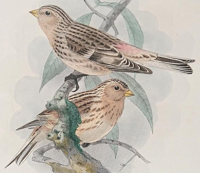 タイトルは「Eastern Twite. Linota brevirostris.」、現在使われている学名は「Linaria flavirostris brevirostris 」、