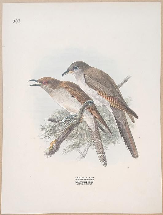 1871年 Dresser ヨーロッパ鳥類史 Pl.301 カッコウ科 ハシグロカッコウ Blackbilled Cuckoo キバシカッコウ Yellow Billed Cuckoo dress301
